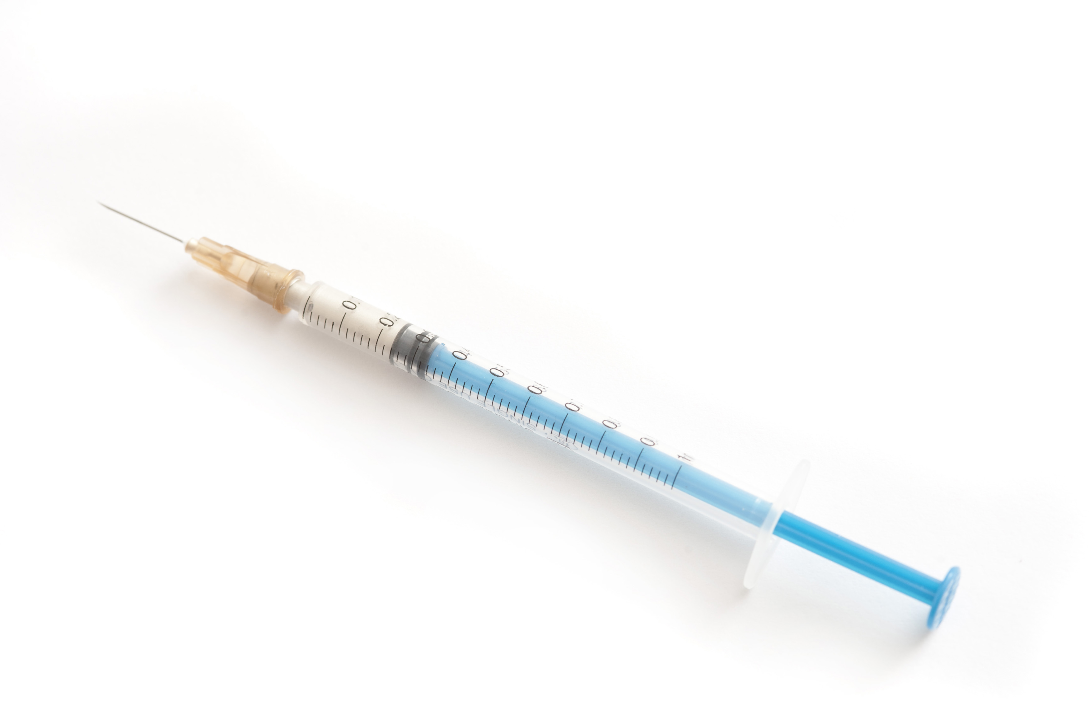 Image Description: High Angle View of Syringe Filled with Injectable Medication Angled on White Background