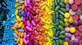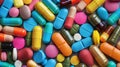 Image Description: Assorted collection of tablets and pills, some still in blister packaging, spread out on a white surface in an oblique angle view