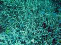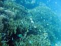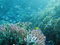 Image Description: a school of tiny blue fish swimming amongst a coral reef