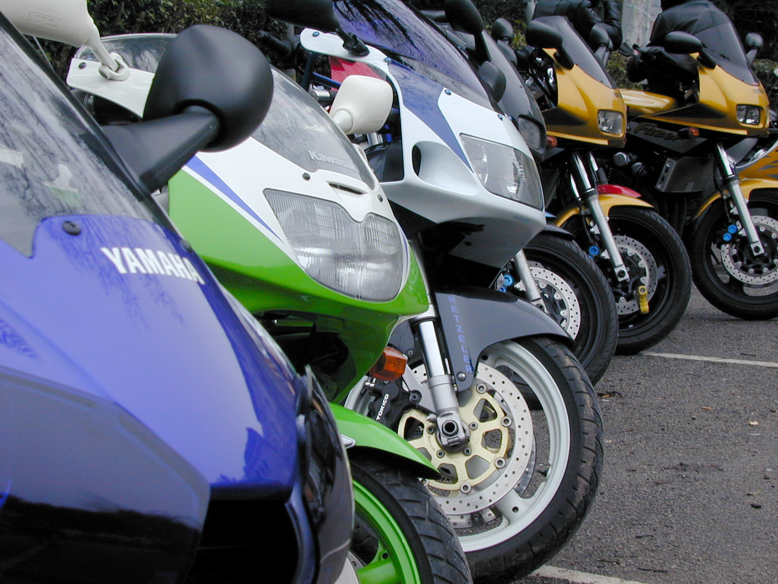 Image Description: Row of various colored and styled motorcycles parked along road from three quarter view