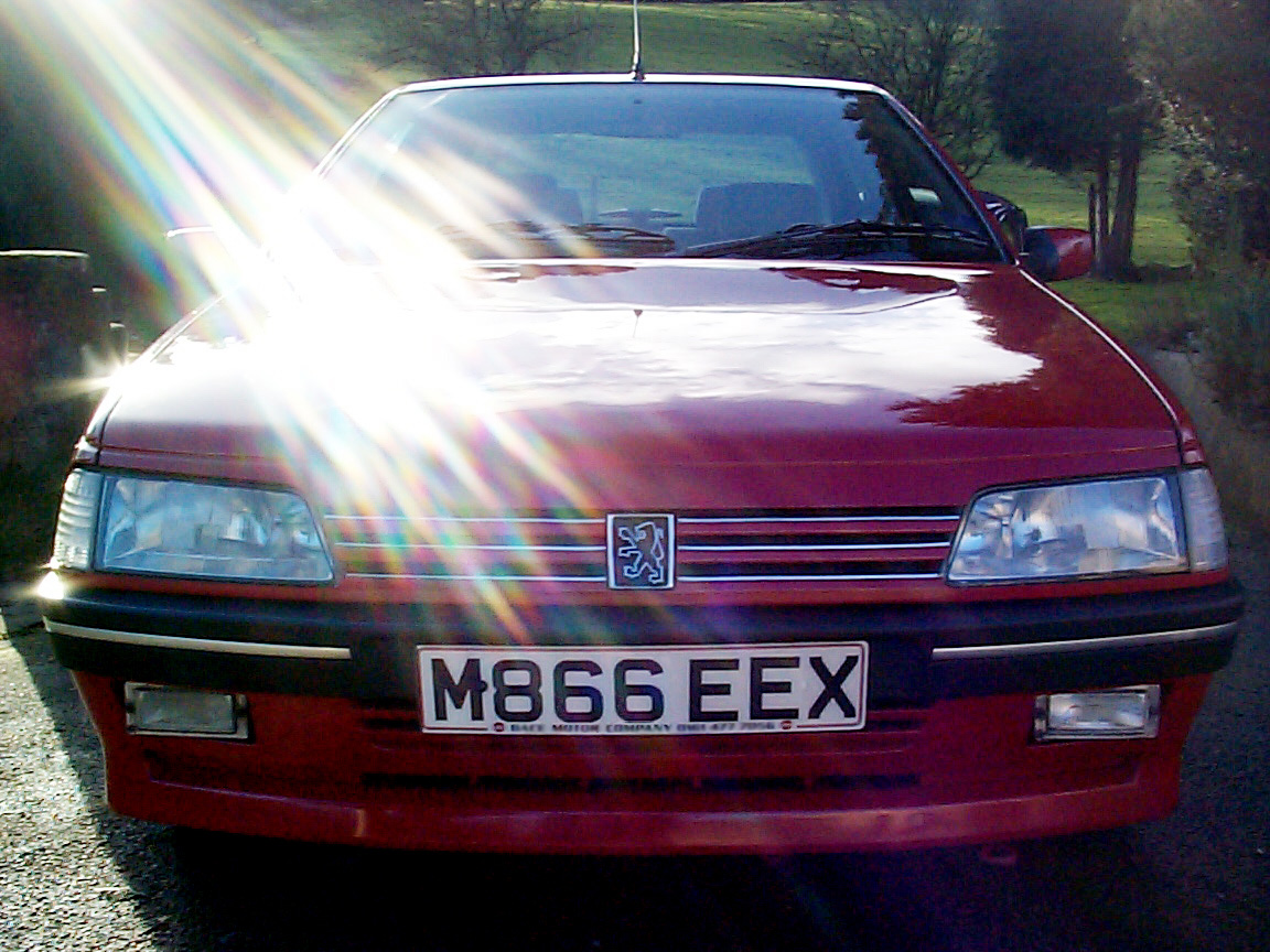 Image Description: Ray of bright sunlight striking the bonnet of a parked red car in a garden or park with a close up view of the grille and number plate with colorful lens flare