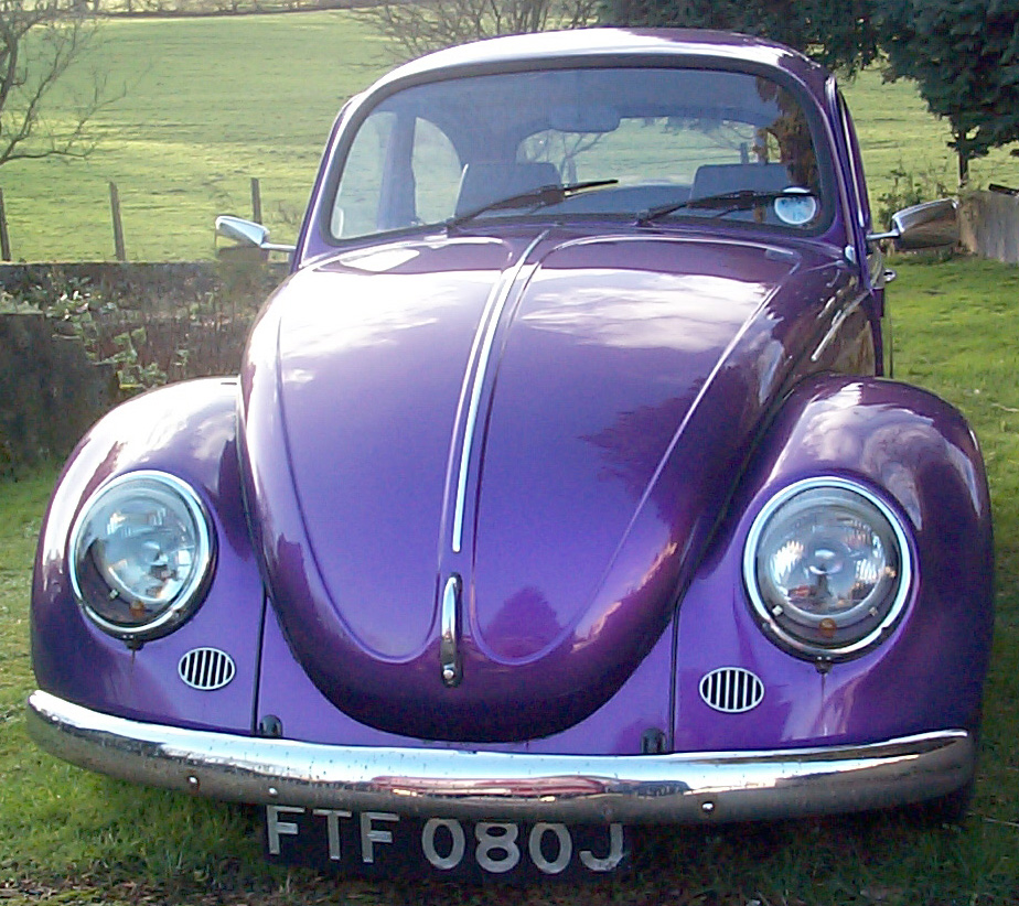 Image Description: Front view of a colorful purple classic Volkswagen Beetle parked on a green lawn in the country