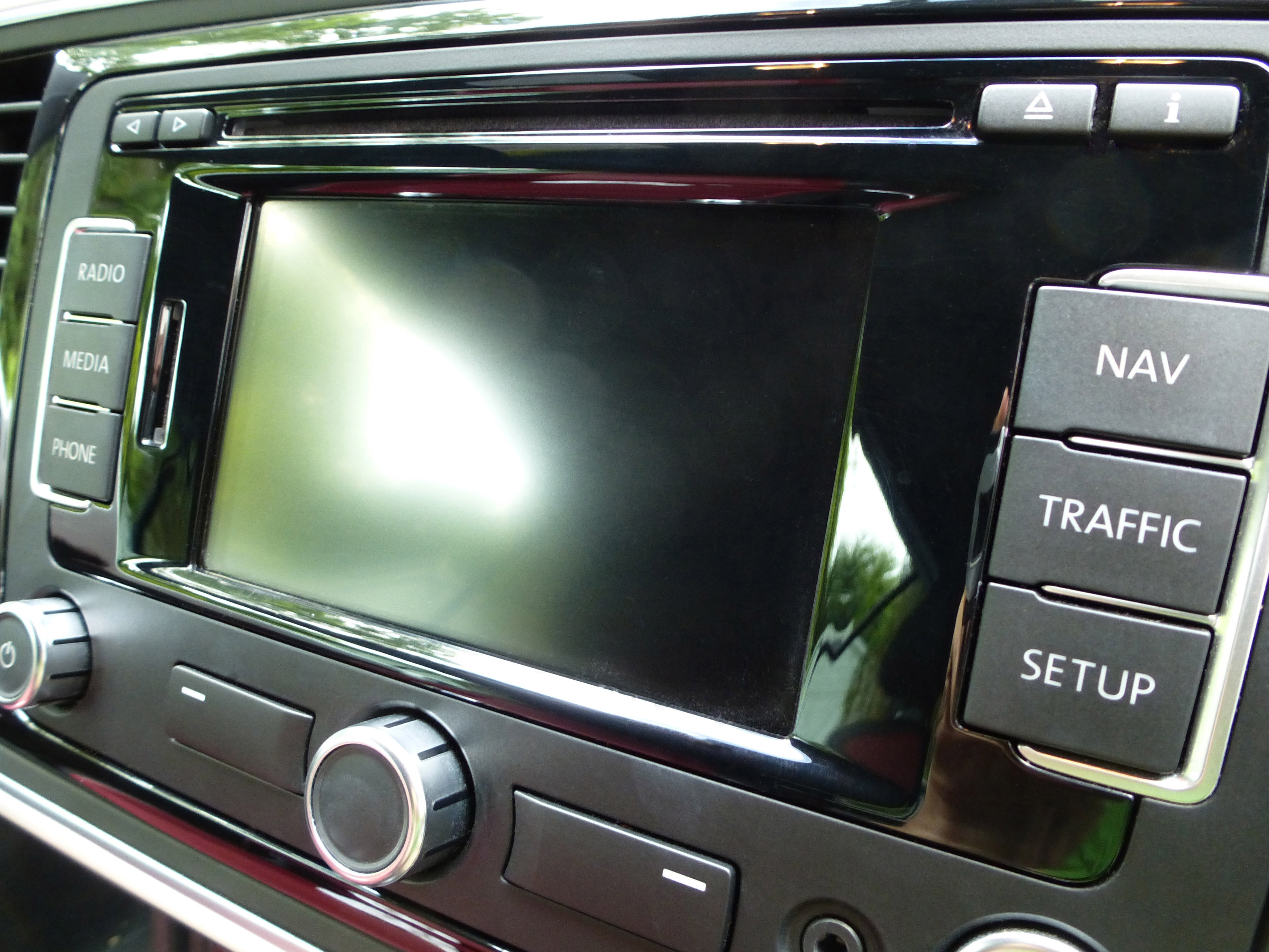 Image Description: Close up on automobile satelite radio controls with powered down blank black screen