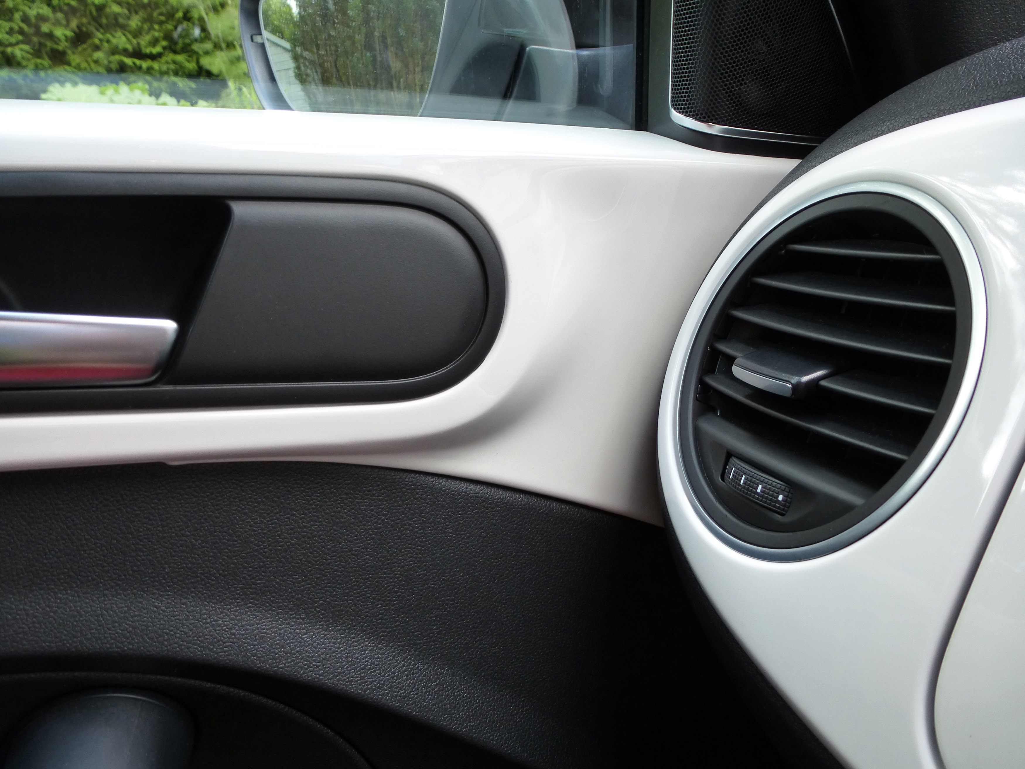 Image Description: Close up detail of circular adjustable vent inside automobile with neutral color scheme
