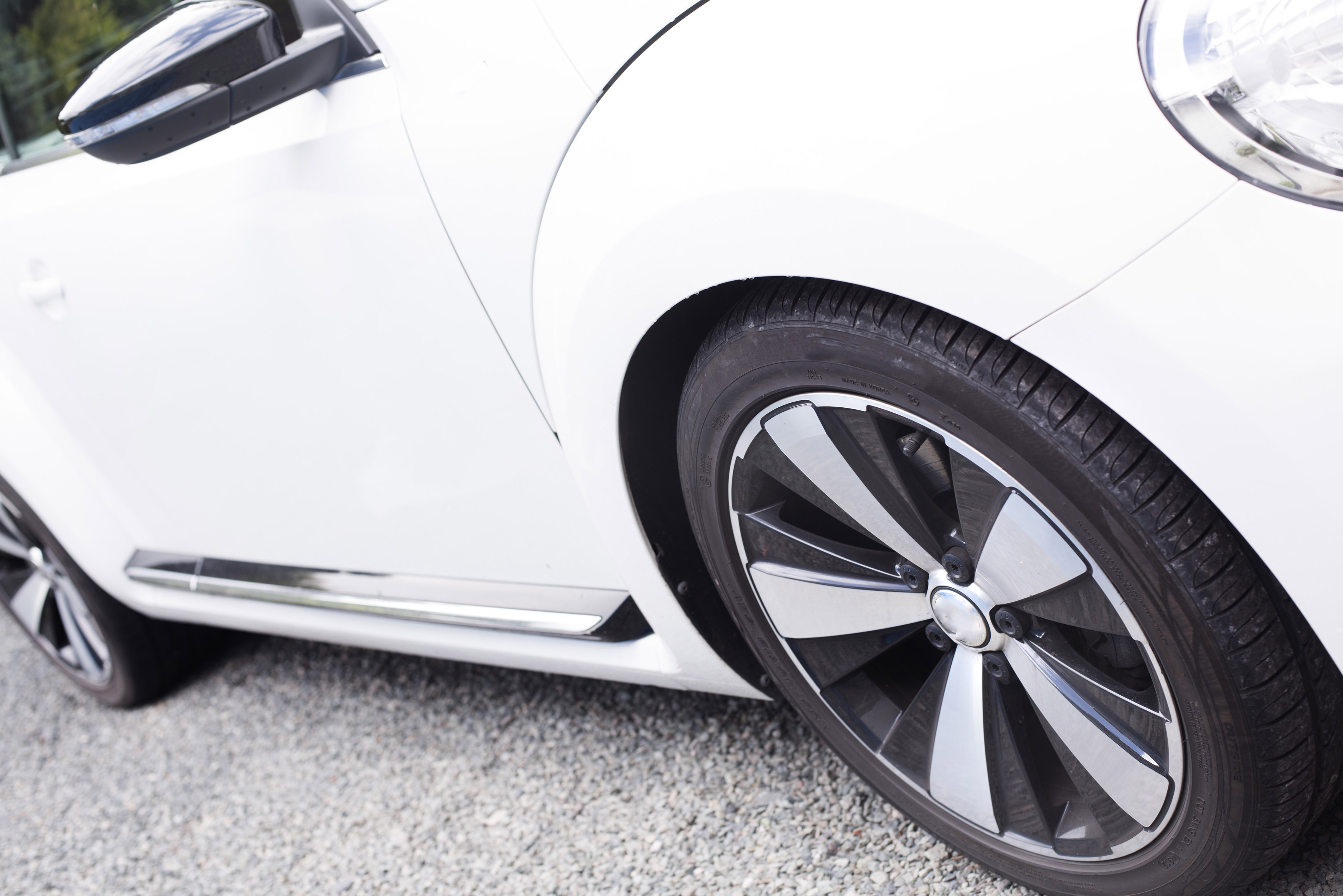 Image Description: Angled close up on side of white sports automobile with complementary black and chrome hubcaps