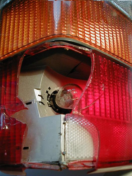 Image Description: Broken red plastic lens on a car light exposing the bulb inside in a close up view