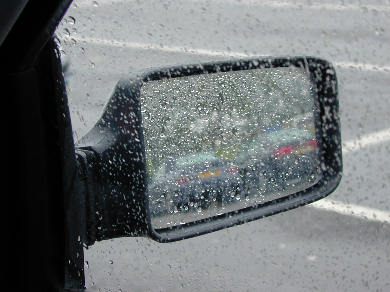 Image Description: Viewing a car side view mirror in the rain through the passenger window covered in condensed raindrops