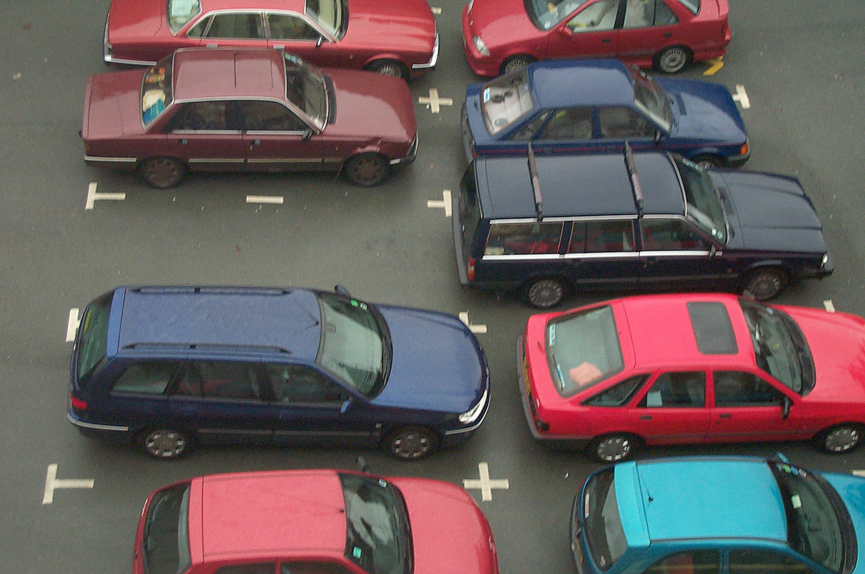 Image Description: Assorted makes and colors of cars parked in a parking lot in a high angle view