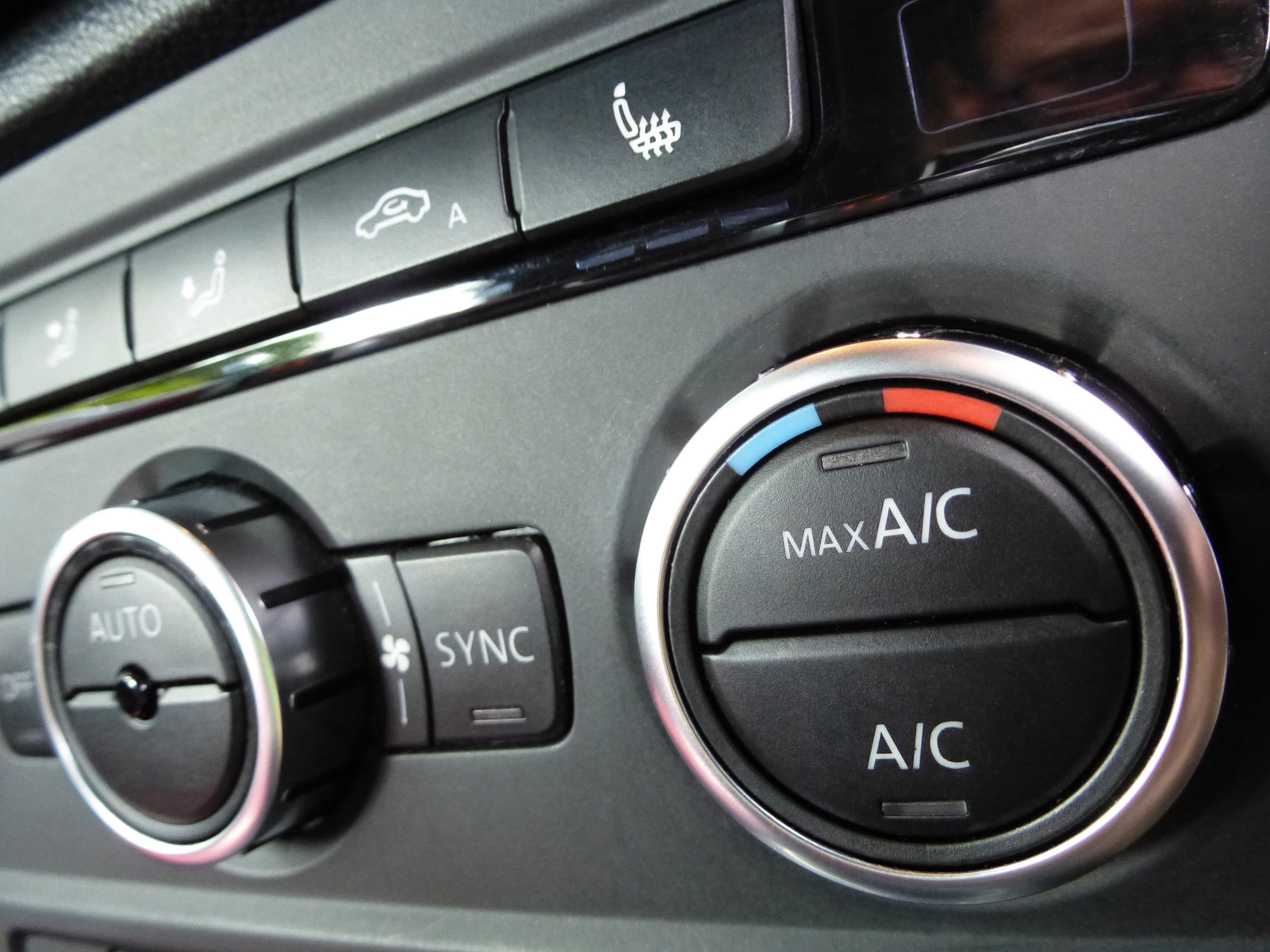 Image Description: Air conditioning control knobs on a black car dashboard in a close up shallow dof view