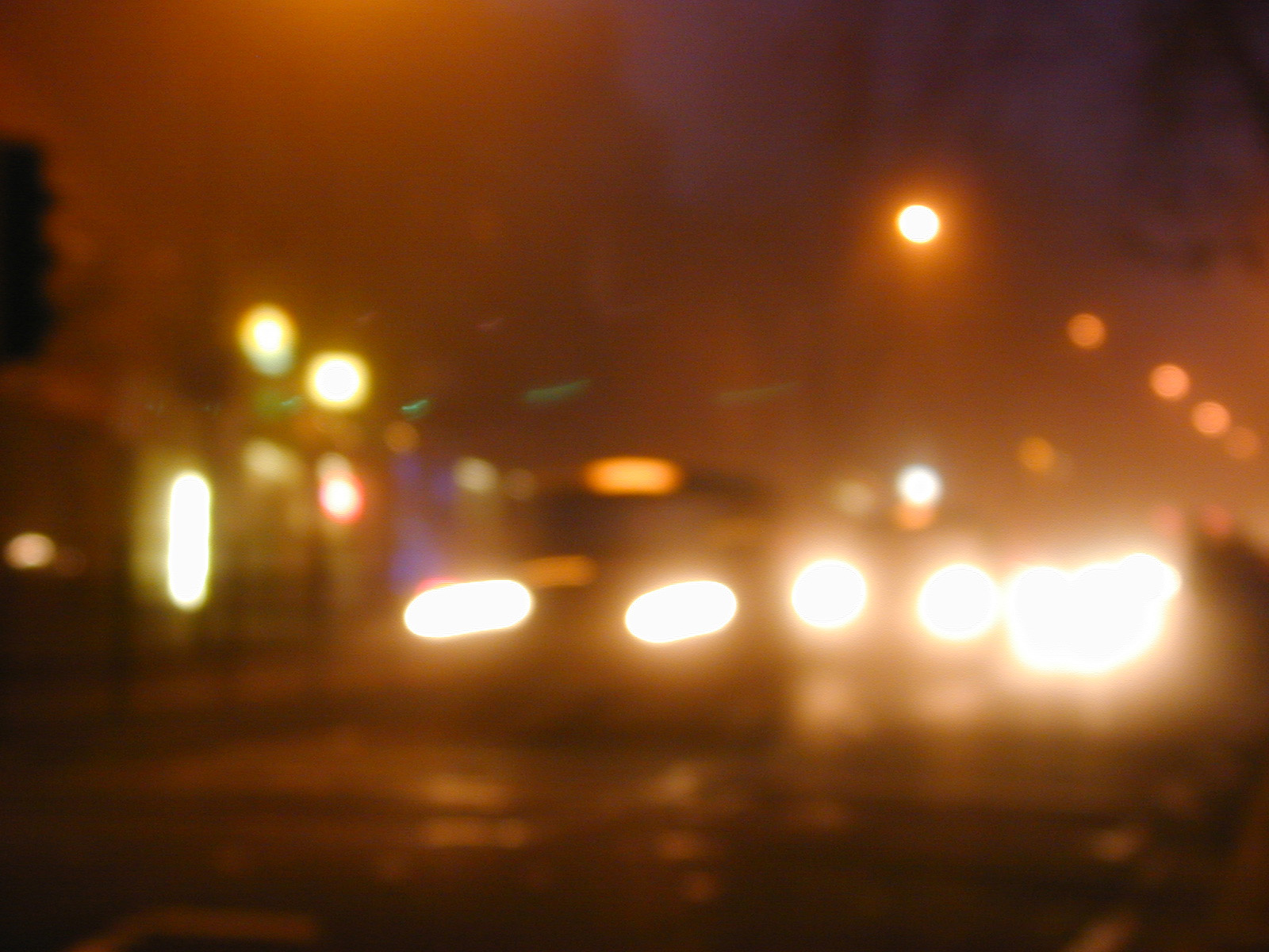 Image Description: Blurry street scene at night with bright streetlights and headlights from various vehicles