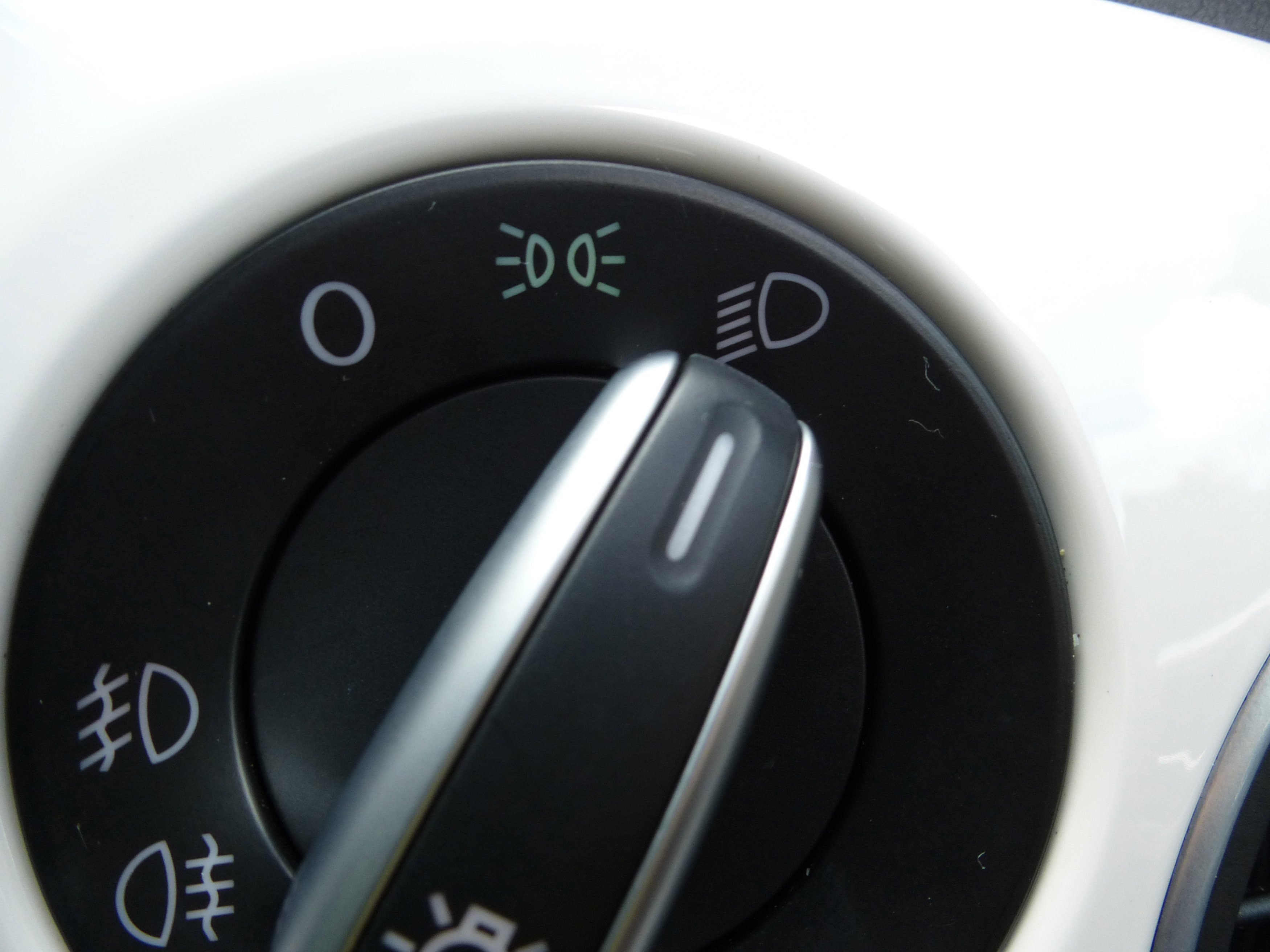 Image Description: Headlight switch on a white car dashboard positioned to full beam in a travel and transport concept