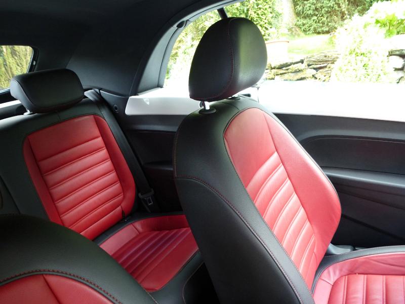 Image Description: Red and black seats in a modern car parked outdoors in a garden showing both the front and rear upholstery