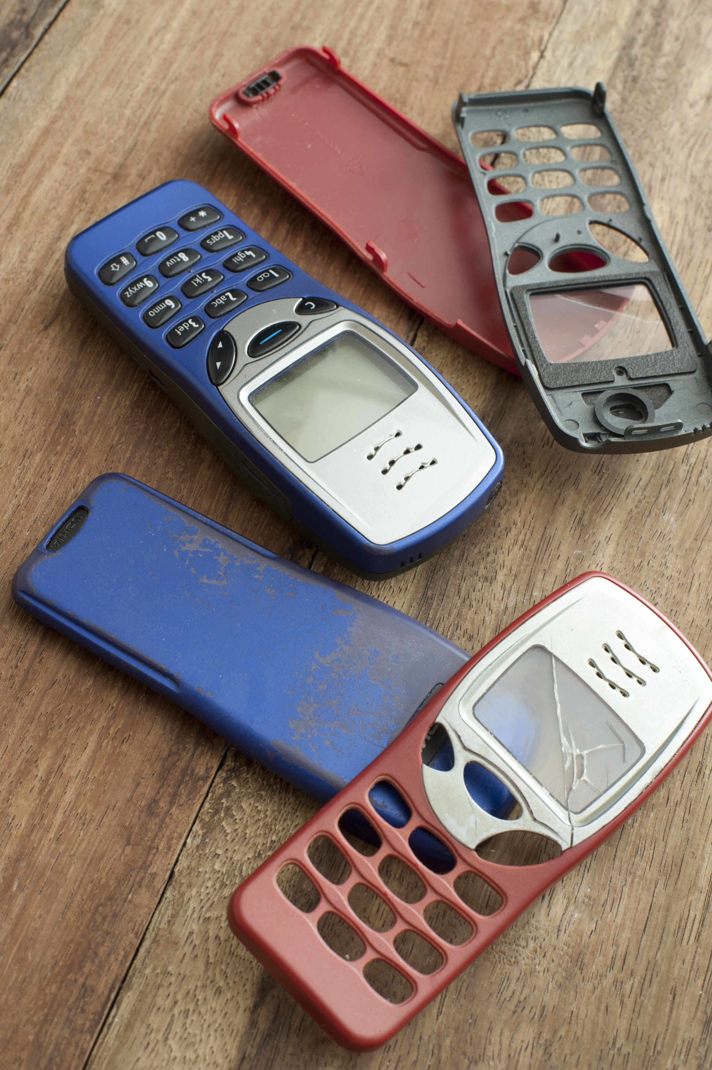 Image Description: Assorted old mobile phone covers or cases in red blue and black for push button phones, some broken and damaged