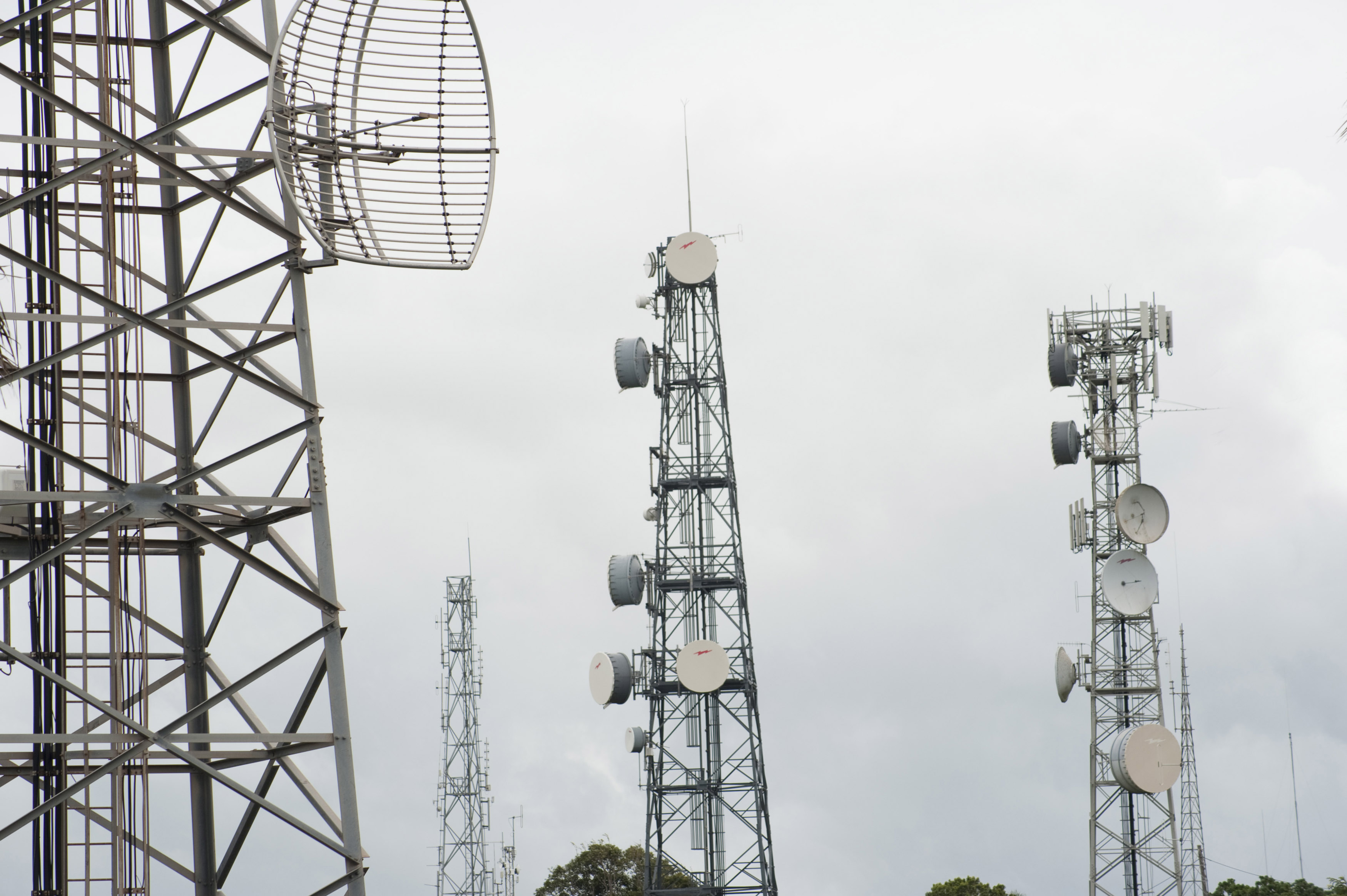 Image Description: Series of communications towers with antennae for mobile phones on a grey cloudy today