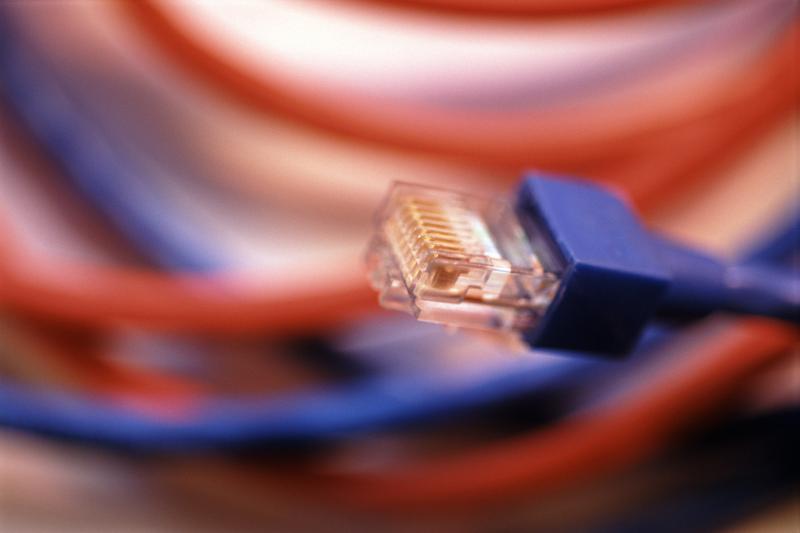 Image Description: Red and blue ethernet cables and plug with selective focus to the connector for transmission of internet data on a computer in a technology and communication concept