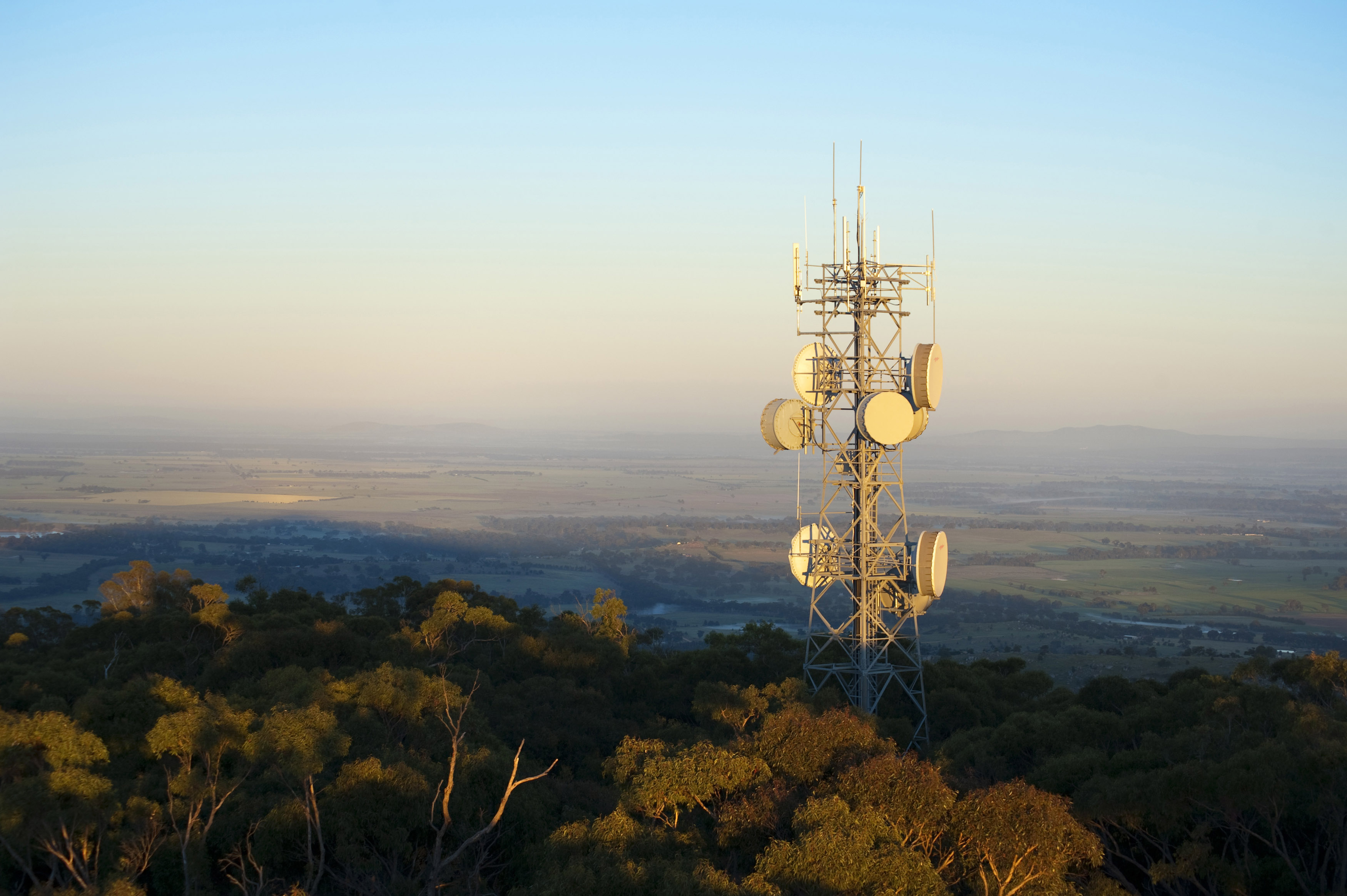 Image Description: Mobile phone communications mast on a forested hilltop with dish antennae in an open landscape at sunset
