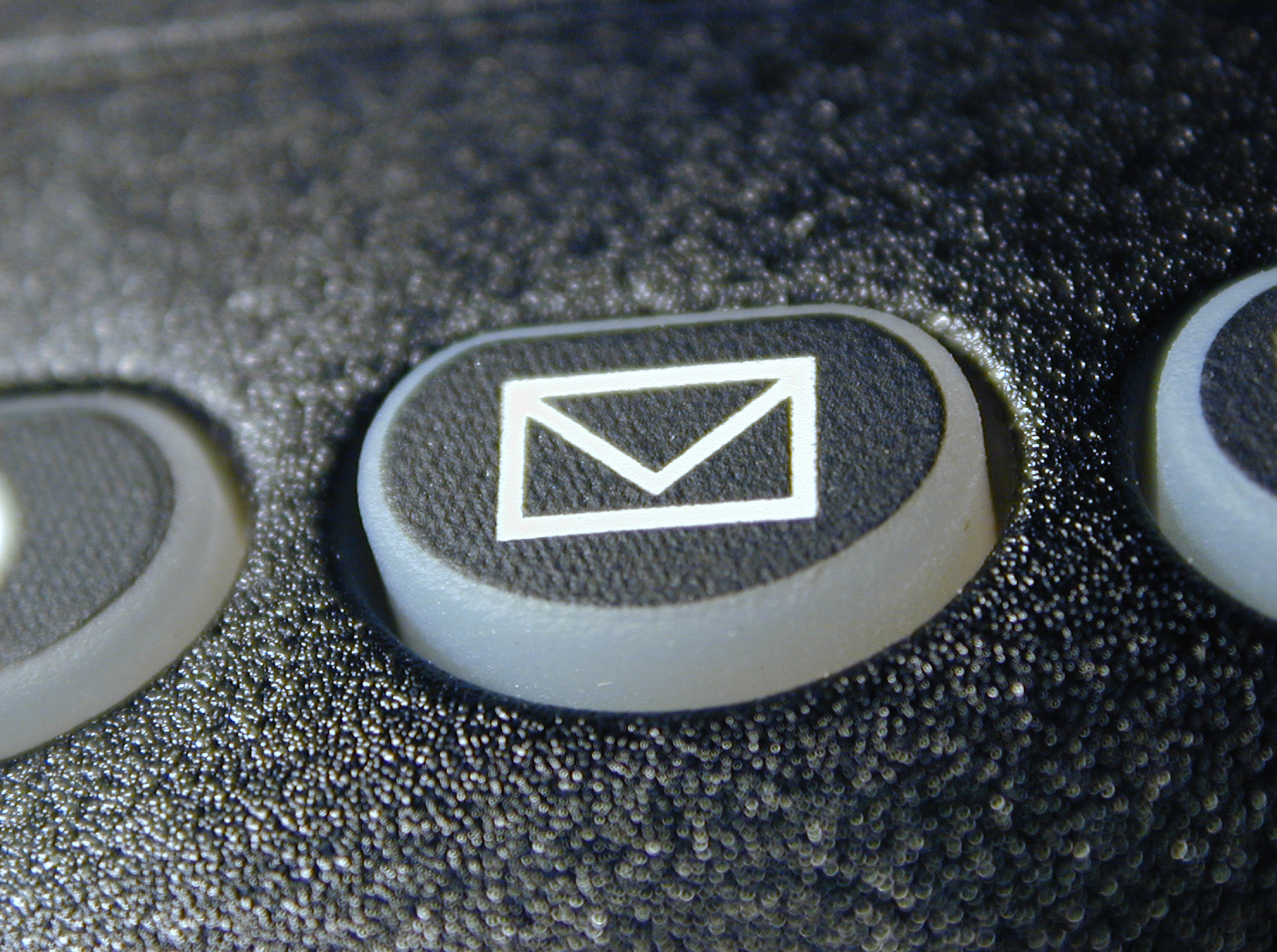 Image Description: Envelope mail or message icon on a black keypad with buttons on a retro telephone or cellphone in a communication concept