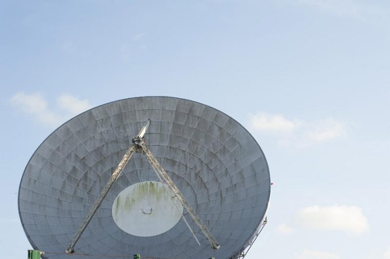 Image Description: Large parabolic satellite dish or antenna against a sunny blue sky with copy space in a telecommunications concept