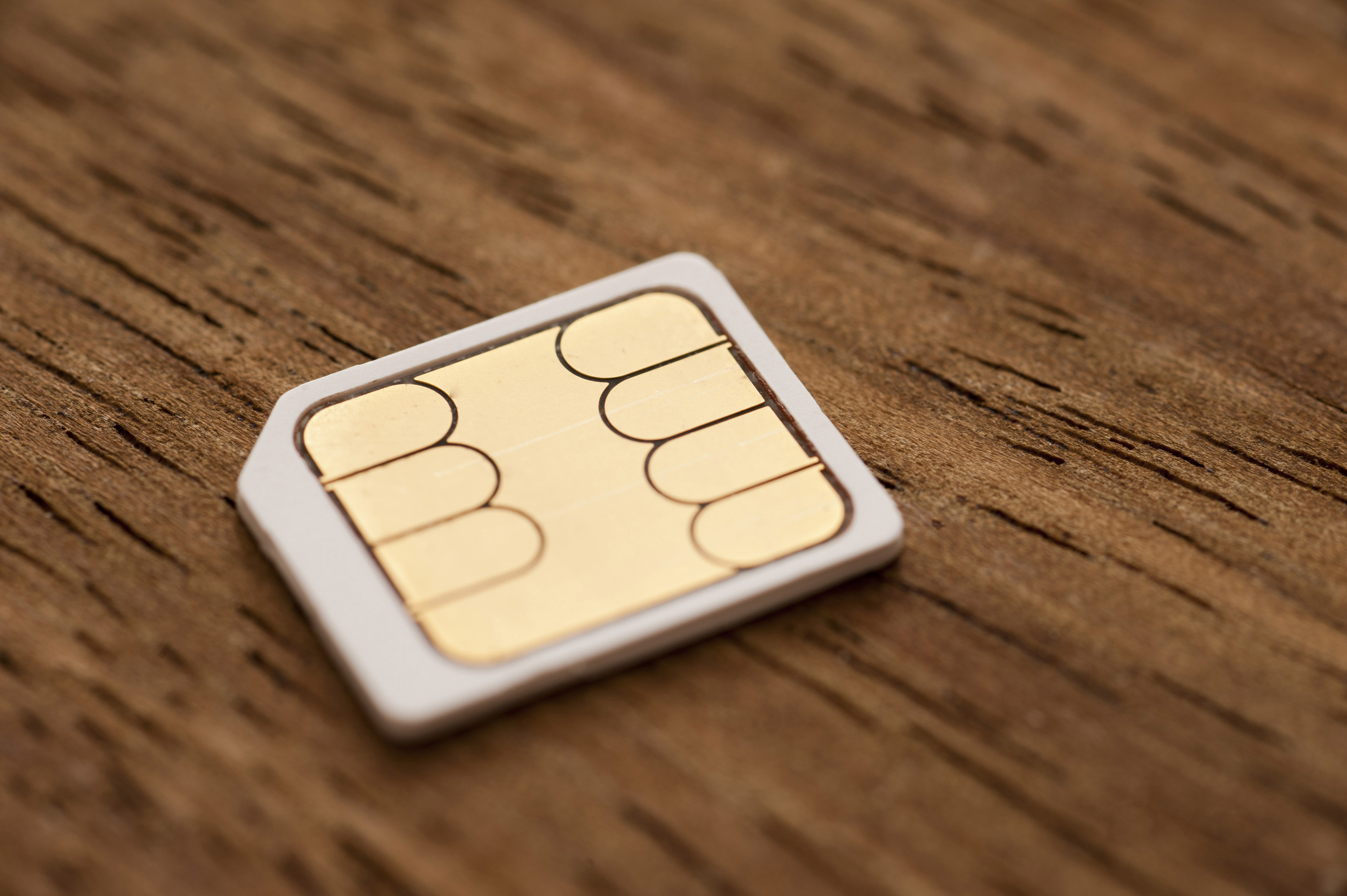 Image Description: Micro-sim card for a mobile phone on a wooden background with shallow dof and partial focus in a communication concept