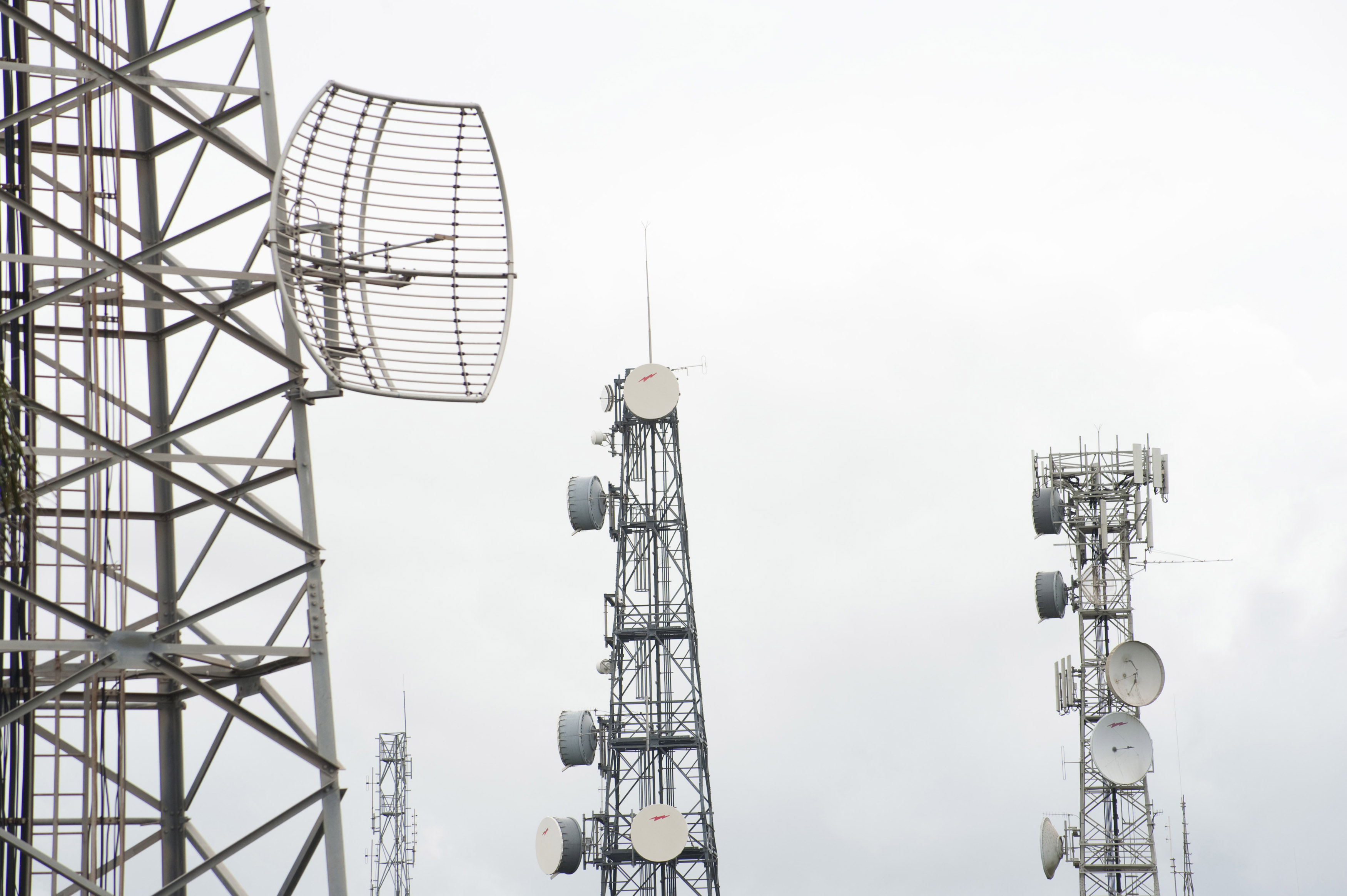 Image Description: Three mobile telecommunications towers in mist or cloud with dish antennae to receive and transmit radio signals