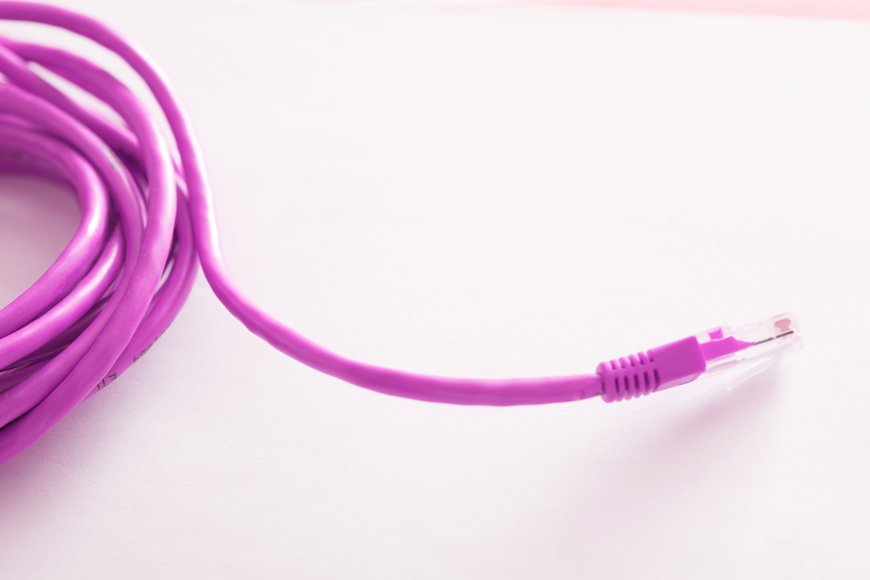 Image Description: Bright vivid pink computer network cable and plug coiled on a white background with copy space in a communications concept