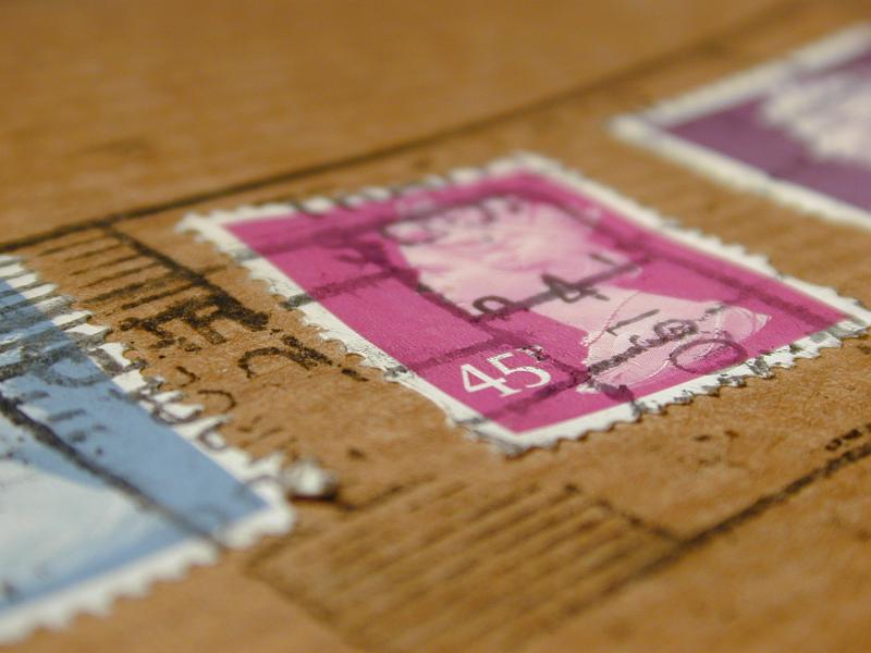 Image Description: Low angle view of a cancelled British postage stamp on a brown paper wrapping with focus to the price of 45p