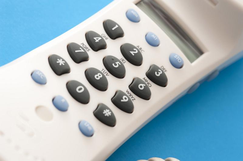 Image Description: Keypad or dial pad on a white plastic terrestrial telephone handset viewed close up over a blue background in a communications concept