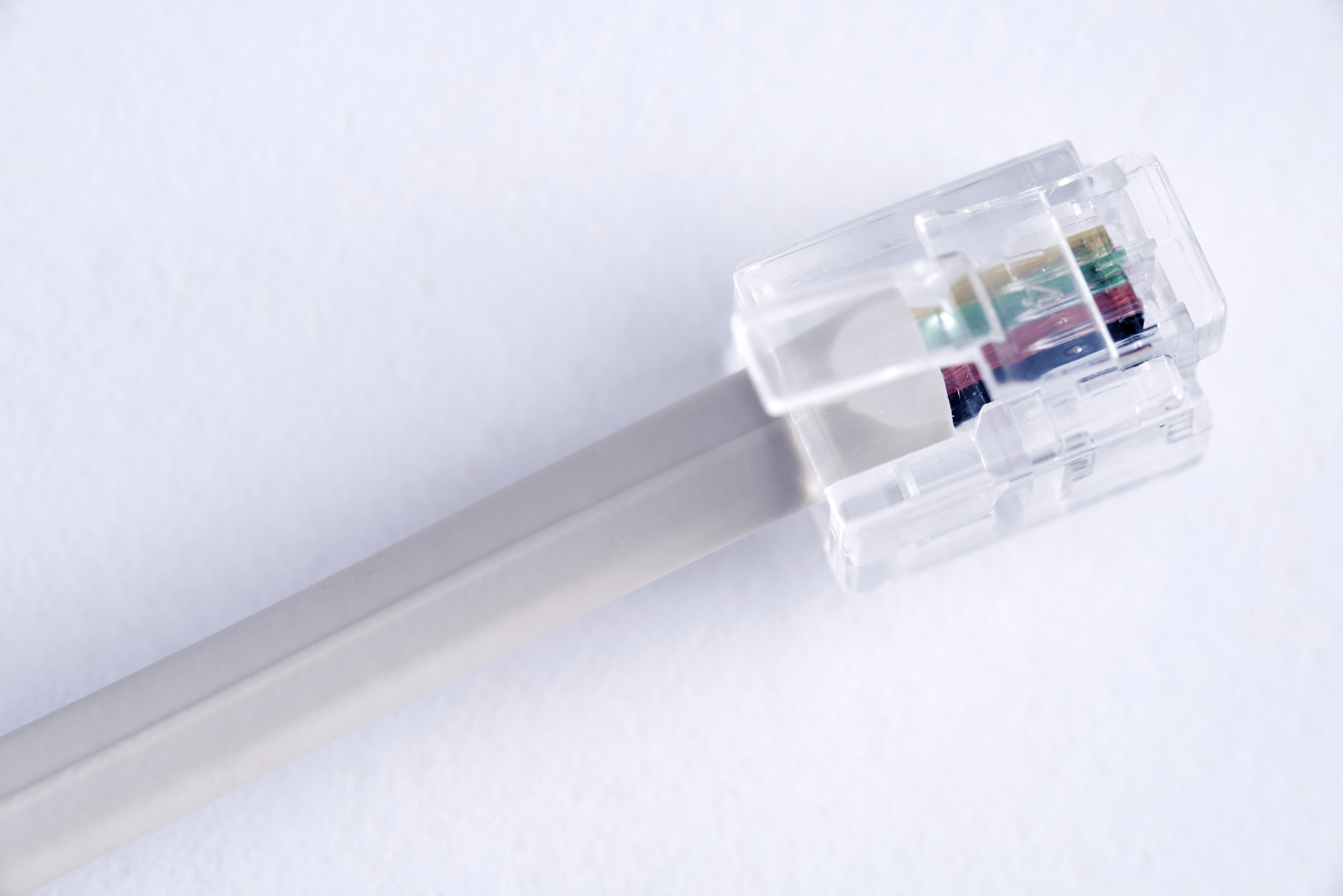 Image Description: Transparent telephone plug on a cable showing the colored wires over white in a telecommunications concept