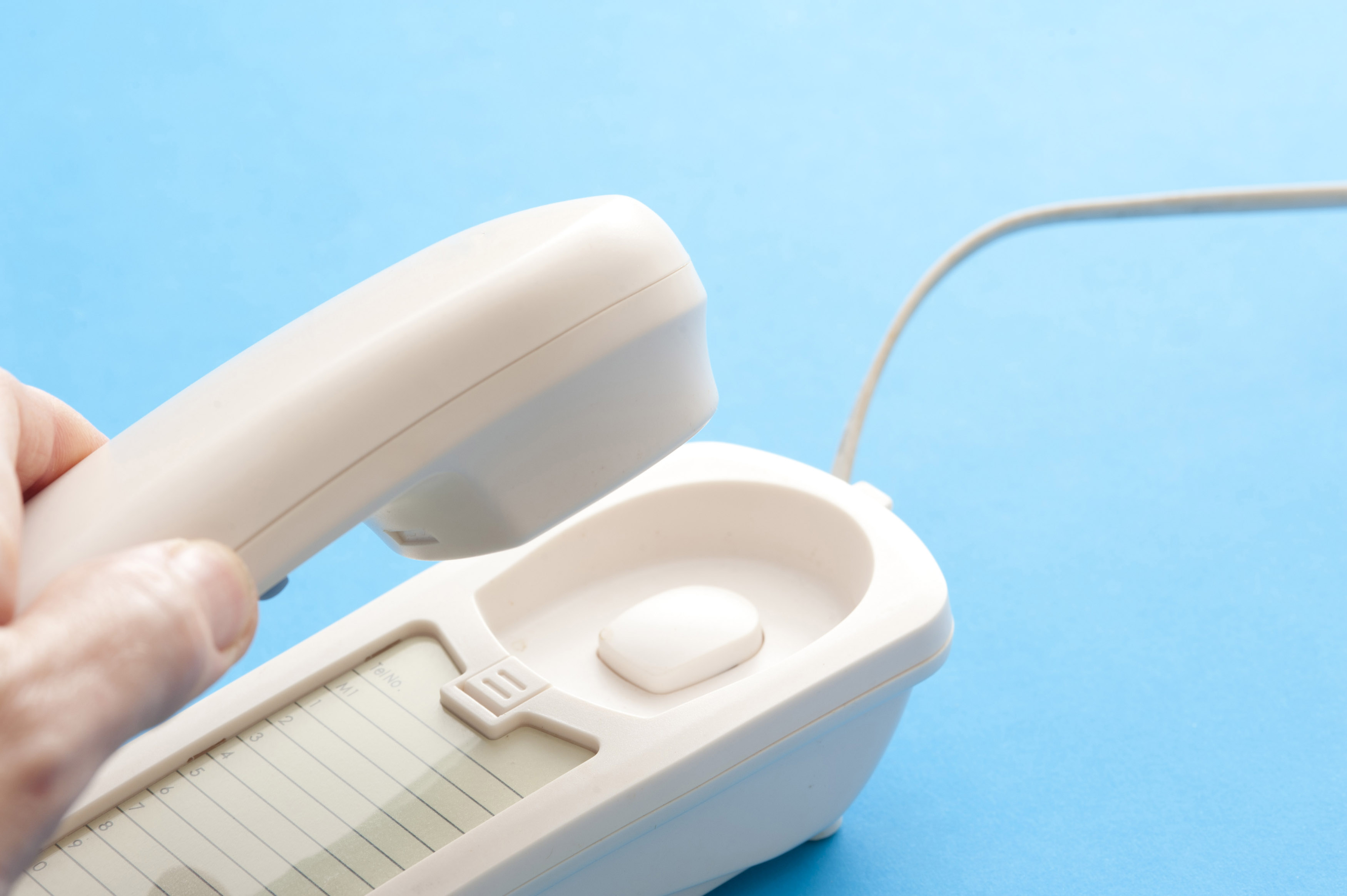 Image Description: Male hand lifting a telephone handset off the base set of the instrument as he answers a call, close up view over blue