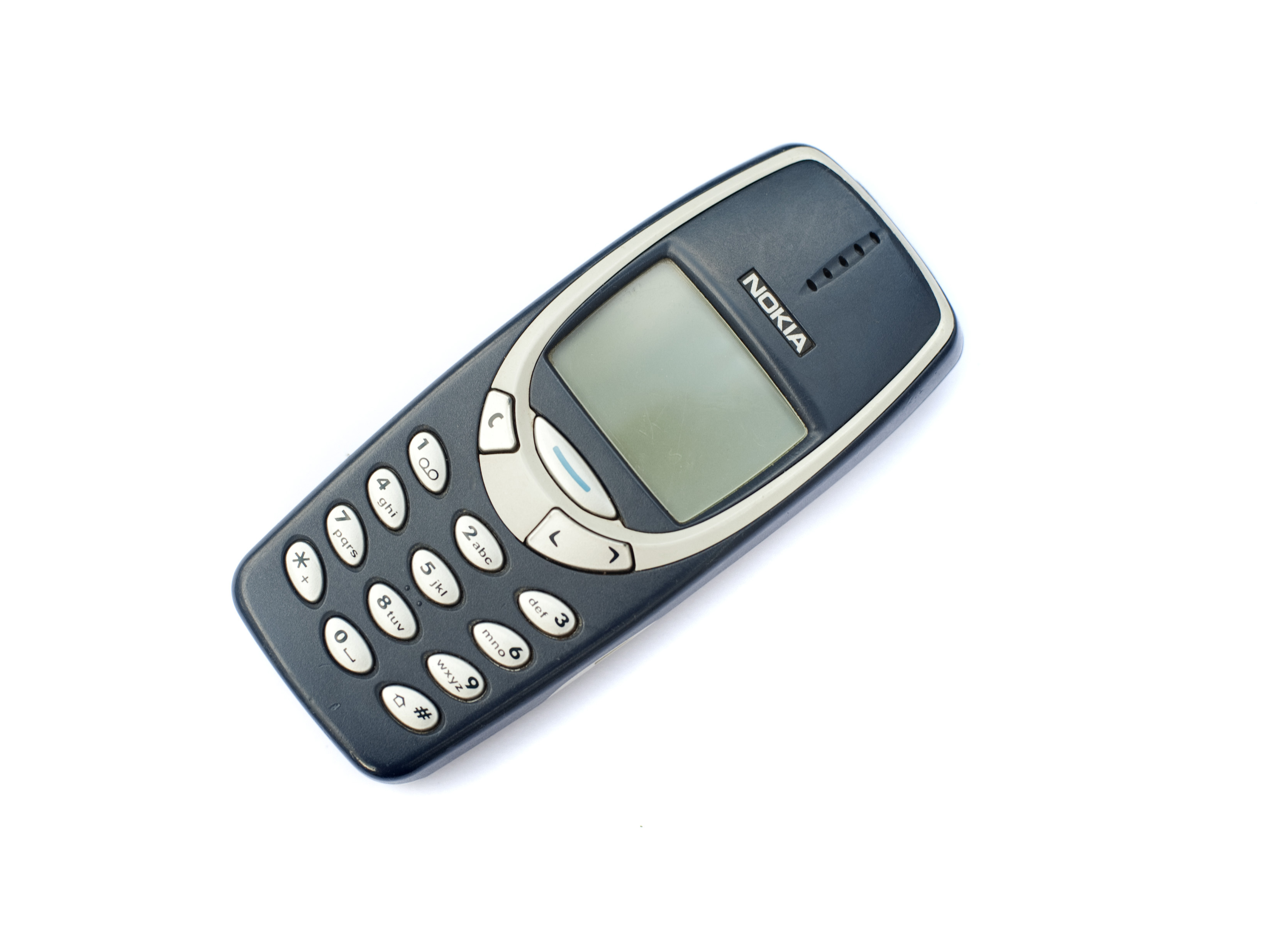 Image Description: Black cover for a retro Nokia mobile phone handset with button design lying diagonally on white with copy space - not property released