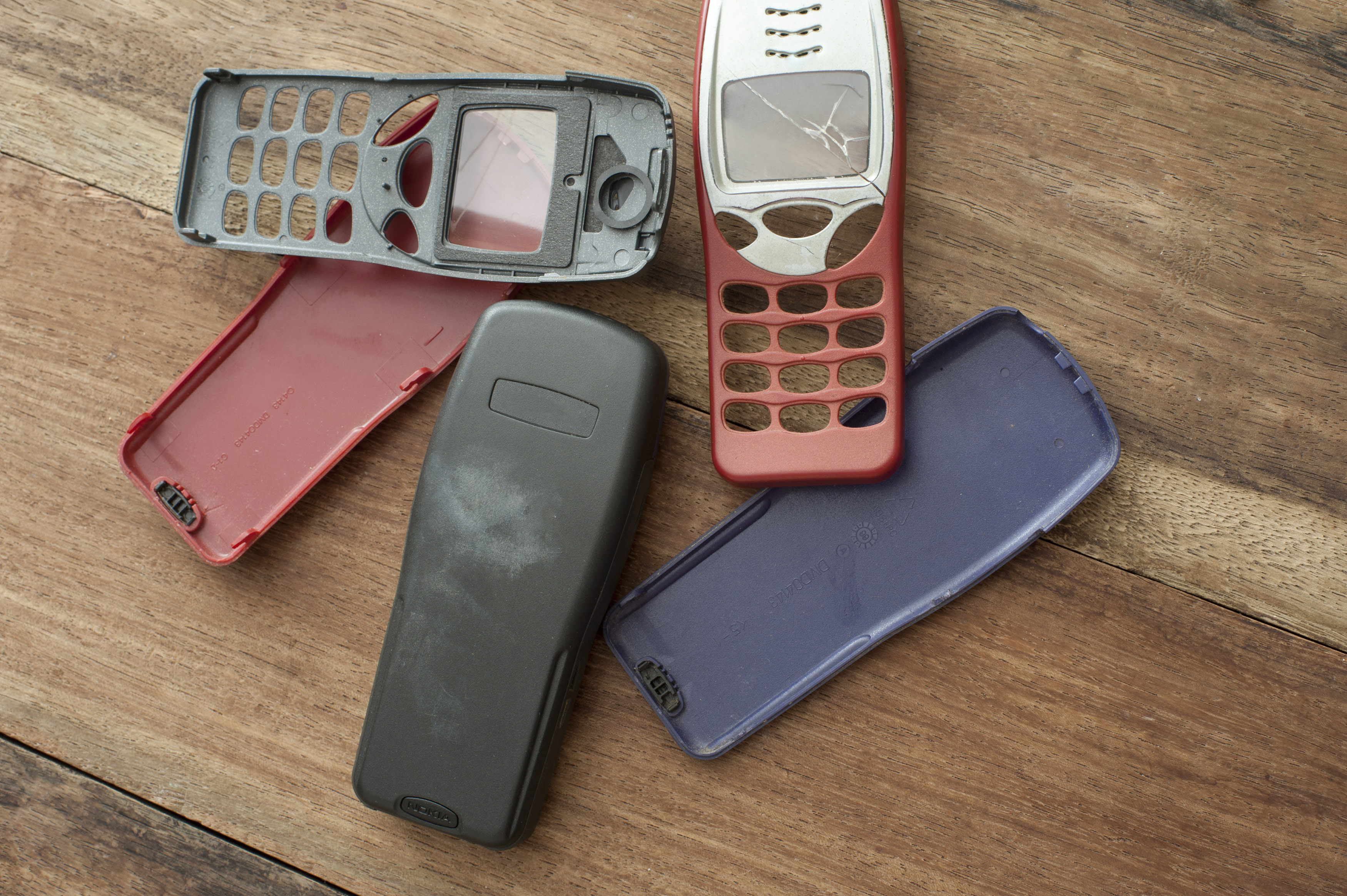 Image Description: Collection of old retro cellphone or mobile phone covers or cases in assorted colors for button keypads, some damaged, lying on a wooden desk - not property released