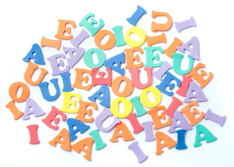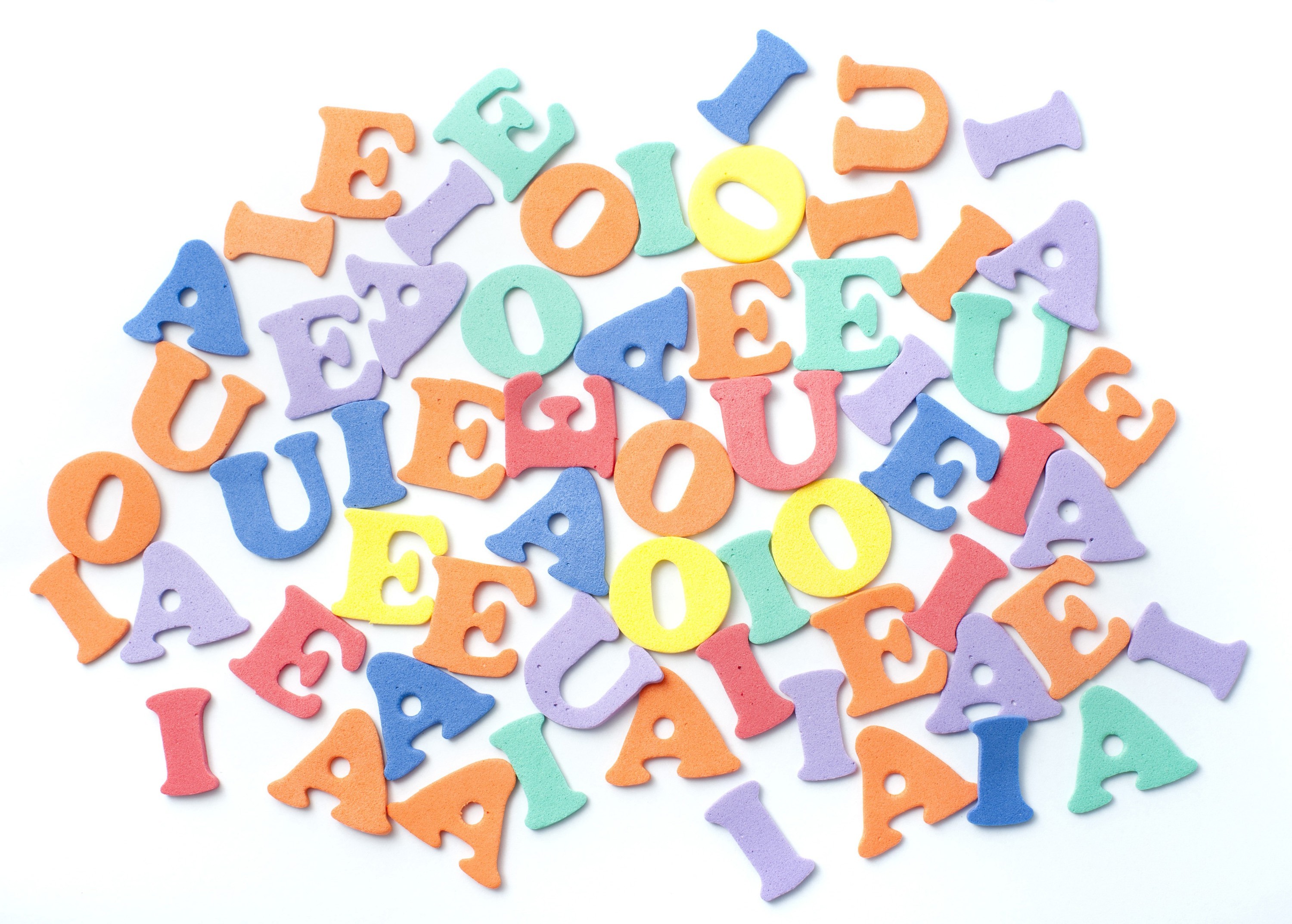 Image Description: Collection of plastic vowels scattered randomly on a white surface for use in teaching children basic language and grammar and to read, write and spell