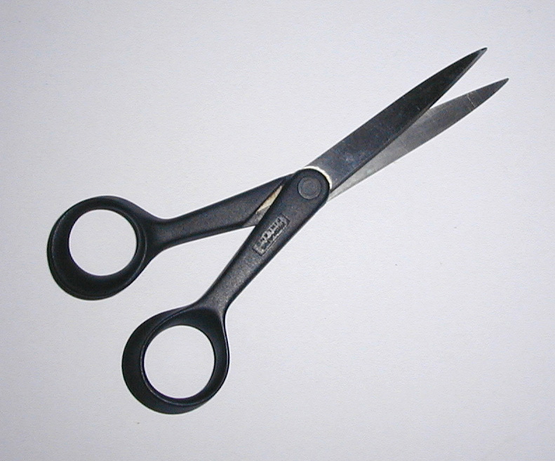 Image Description: Close up view of sharp scissors with black rounded handles against a white background