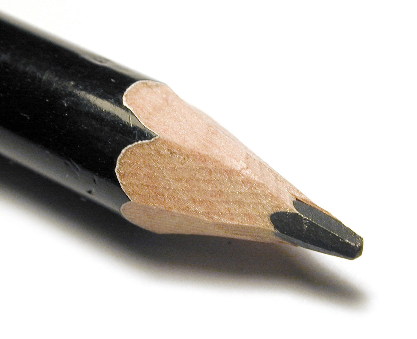 Image Description: Sharpened black wooden pencil point in a close up macro view over white with shadow