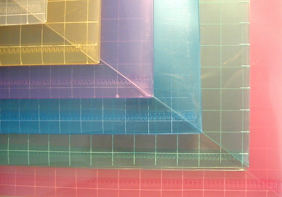 Image Description: Colorful sheets of colored plastic ruled with squares arranged offset with their corners aligned for a geometric background pattern