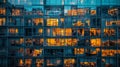 Image Description: Modern skyscraper office block at night with interior lights illuminated showing office furniture and layout