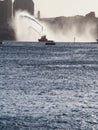 Image Description: Fireboat on the water spraying high pressure jets of water in a display showing how to douse a blaze