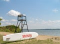 Image Description: A surf rescue surfboard resting in a special bracket alongside the waters edge on the seashore ready for immediate use